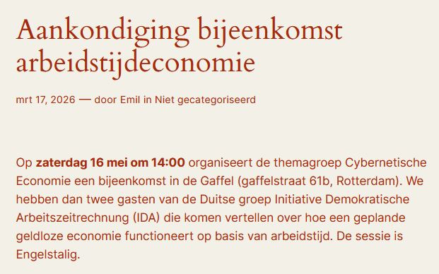 “On Saturday, May 16, at 2:00 PM, the Cybernetic Economy thematic group is organizing a meeting at De Gaffel (Gaffelstraat 61b, Rotterdam). We will be joined by two guests from the German group Initiative Demokratische Arbeitszeitrechnung (IDA), who will discuss how a planned cashless economy functions on the basis of working time. The session will be conducted in English.
